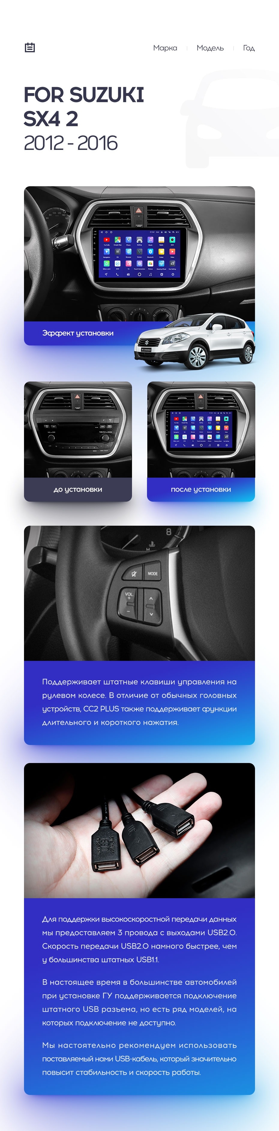 Полный комплект установки магнитолы Teyes с рамкой и проводкой можно выбрать в каталоге штатных магнитол Suzuki SX4 2 (2012-2016).