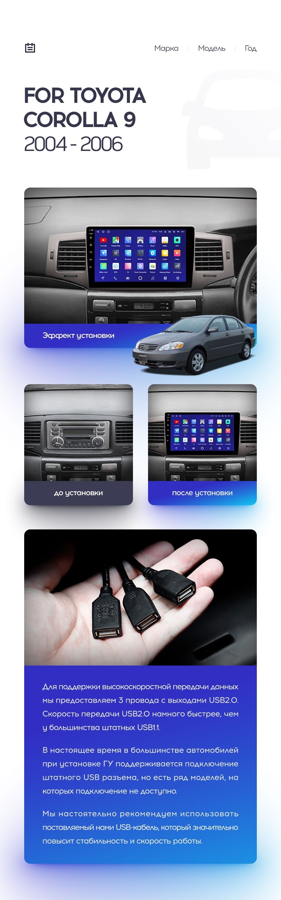 Установочный комплект для Toyota Corolla 9 E120 (2004-2006) включает переходную рамку и проводку.
